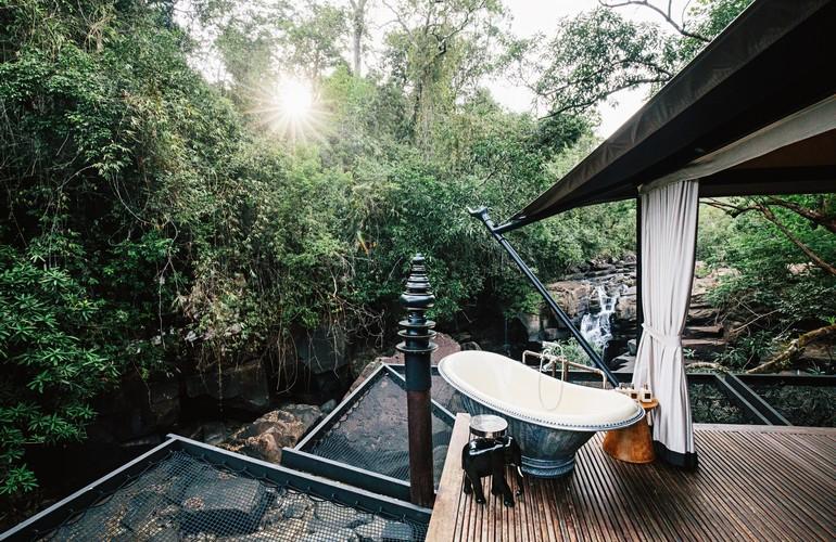 15 private tents promise the utmost comfort and luxury with breathtaking views along the riverbank. Guests are paired with an adventure butler to tailor unforgettable activities to match their taste and fitness with all activities included with the room rate. The Headquarters restaurant serves a selection of Cambodian and Southeast Asian dishes using locally sourced ingredients. Should guests wish to be pampered, the Khmer Tonics spa offers a range of treatments amid giant natural rocks perched in the forest canopy.