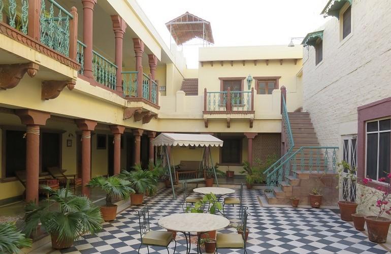 Turning off a busy road in central Jodhpur, one finds an oasis of calm amongst the gardens and courtyards of Ratan Vilas. A smart medium-grade property - part original family home, part tasteful new construction - consists of 24 simple but well-sized and well-equipped rooms. Each room has some outside space, either looking out on a central courtyard, onto the gardens, or across the attractive swimming pool. Owner Brijaj and his family live on site, and keep guests well-hosted with excellent food and insider advice on their home city. The property is well-located for all sightseeing, and is a 5-minute tuk tuk ride to the clock tower area for shopping and exploring.