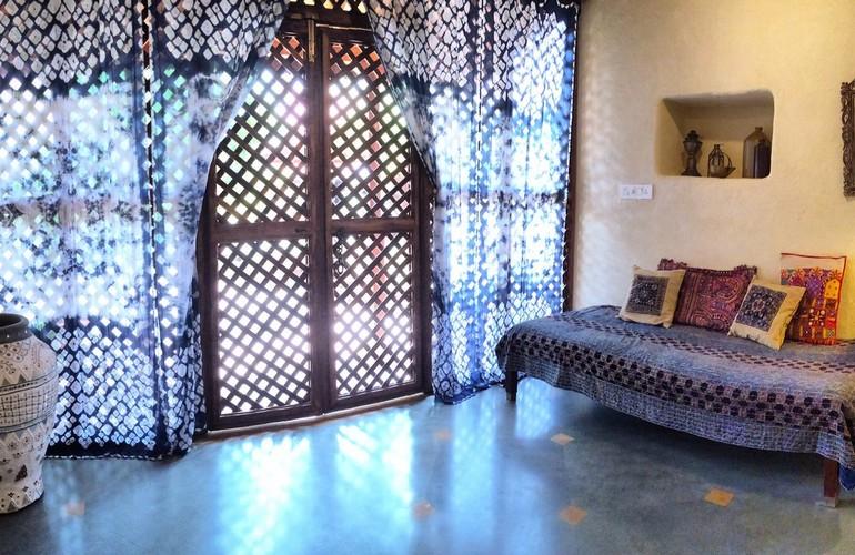 The Bhuj House is a traditional Parsi courtyard house dating back to the 19th century. The house has belonged to the Bhujwala family for six generations and has been lovingly restored and opened as a heritage homestay. The four individual guestrooms open onto the inner courtyard and are decorated with restored antique furniture and local Kutchi fabrics. Homemade Parsi and Kutchi dishes are prepared using locally sourced ingredients and served in the outdoor dining area.