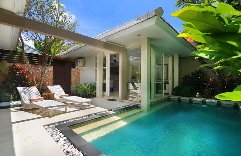 Villa White Pearl is a clean and modern two-bedroom villa located in the fashionable area of Petitenget in Seminyak with its palm tree lined lanes and numerous cafes and restaurants. The two spaciously appointed bedrooms are decorated in light tones and come with plenty of storage, white marble and sandstone bathrooms with rainfall showers. There is an air-conditioned lounge and dining area decked out with a lengthy sofa, dining table for six and wall-mounted TV. Outside there is a compact paved area with sun loungers, leading to an inviting private swimming pool.