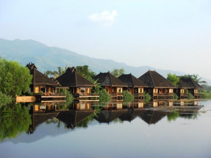 A charming luxury resort built partially on the lake and on the lake's eastern shore, the Inle Princess Resort is tastefully built in regional style and is made entirely of wood. The resort's simple yet elegantly appointed wooden chalets (or 'houses') are decorated with traditionally crafted furnishings and locally woven cotton bedspreads and feature a cosy yet spacious living area and a private balcony. All houses feature the following amenities - shower & bathtub, mini bar, hair dryer & IDD phone. They also have a private terrace with either Inle Lake, private lake or mountain views. The Princess Houses are some of the most stylish accommodation in the Inle Lake region. The resort also offers a dining room and a splendid terrace overlooking the lake serving local specialities, Myanmar, Chinese, Thai as well as tasty western cuisine. The bar is the meeting point of the resort and there is also a souvenir shop and a wine cellar as well as a spa complete with sauna. A recently built swimming pool can be found in the gardens. The hotel has a no-noise policy so no TV's are to be found in the rooms and all boats approaching the resort have to switch off their engines 200 metres from the hotel so as to safeguard the guests' peace and tranquillity.